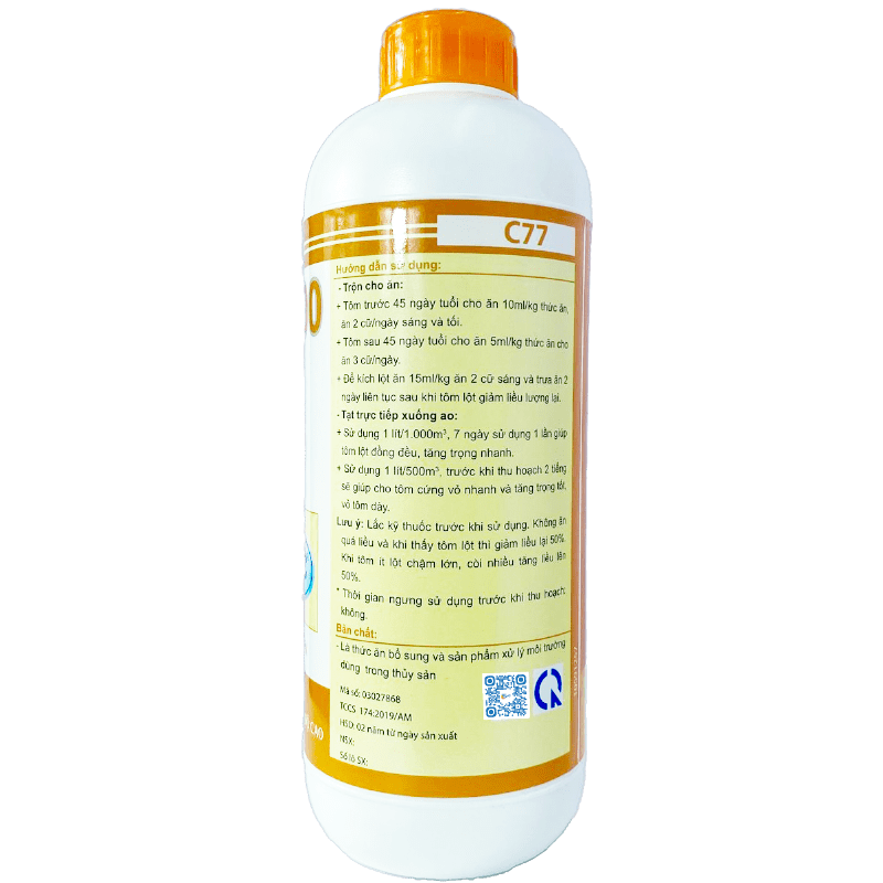 * Lưu ý: Lắc kỹ thuốc trước khi sử dụng. Không ăn quá liều và khi tôm lột thì giảm liều lại 50%. Để tăng nồng độ khoáng trong nước giúp tôm hấp thụ qua mang, bề mặt cơ thể nhanh nên hòa tan trực tiếp vào nước liều dùng 1 lít/1000 m3 nước.